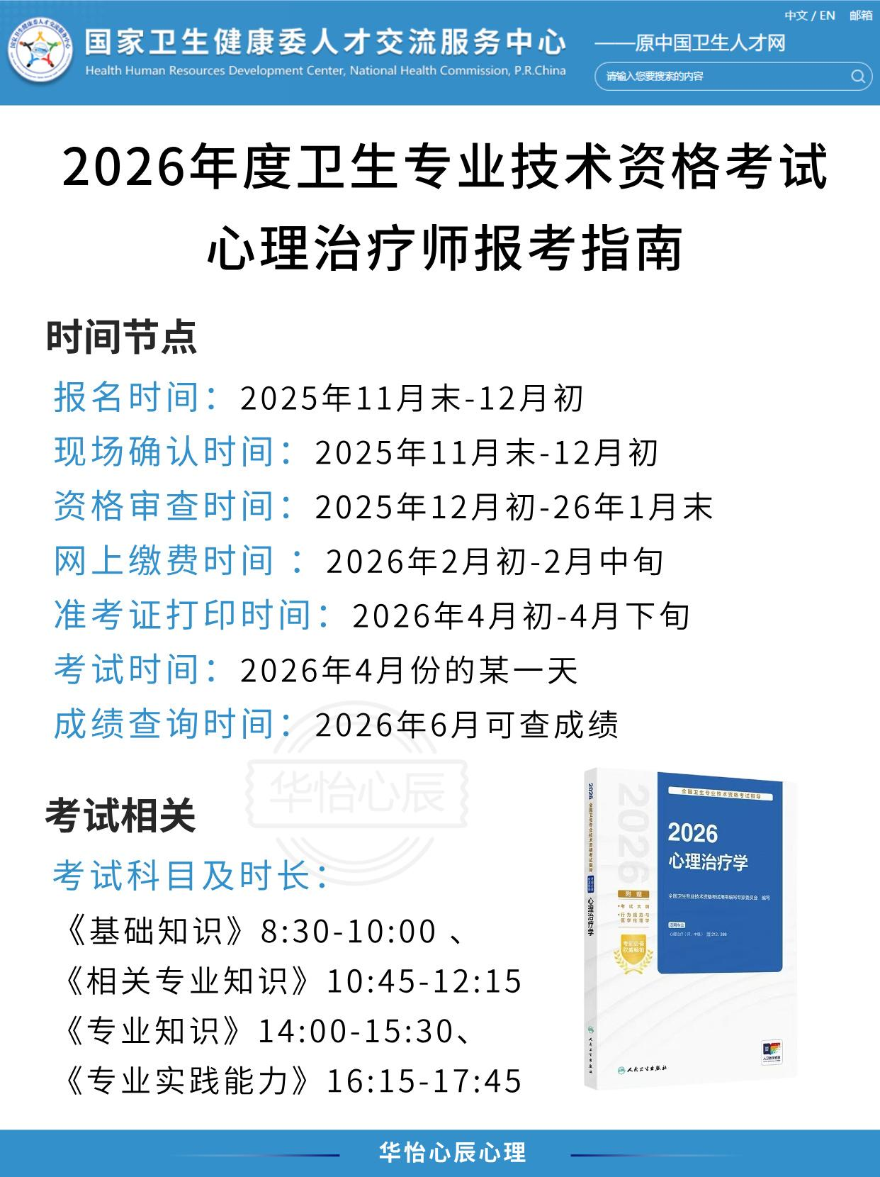 考试时间:每年4月举行全国统一的卫生专业技术资格考试(2026年考试时间由根据国家卫健委通知)