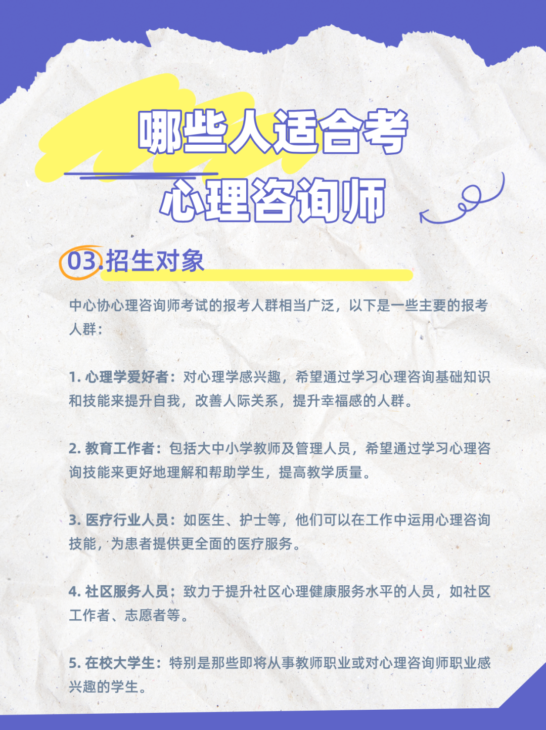 心理咨询师考试适考人群较为广泛,包括教育行业,医疗行业,企业管理行业,司法工作系统,销售,HR等各大行业,企业中的公关/策划/销售/营销人员/客服人员,人力部(招聘、培训、HRBP),行政管理部、售后管理部,企业家/创业者等等。