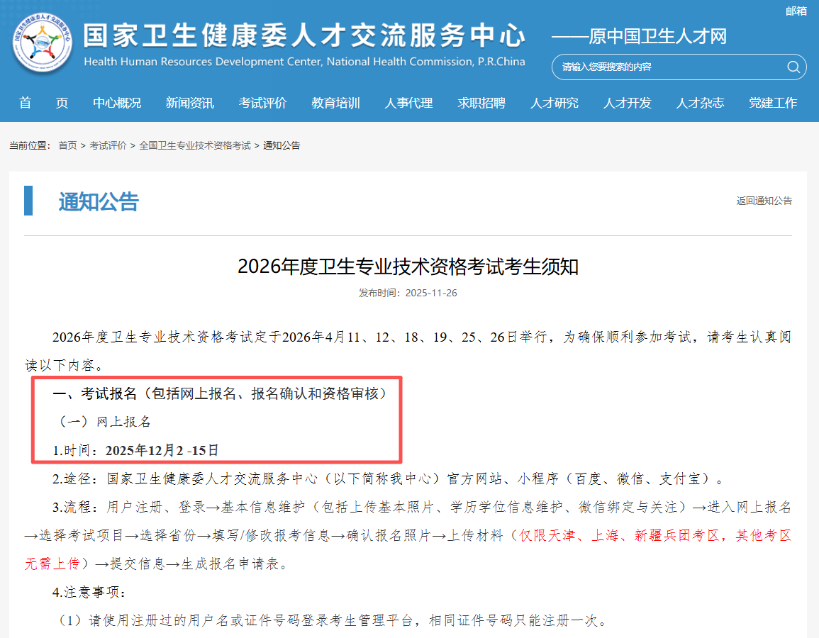 2026年卫生专业技术资格考试报名时间已出,考生可在2025年12月2-15日,完成个人信息填报。