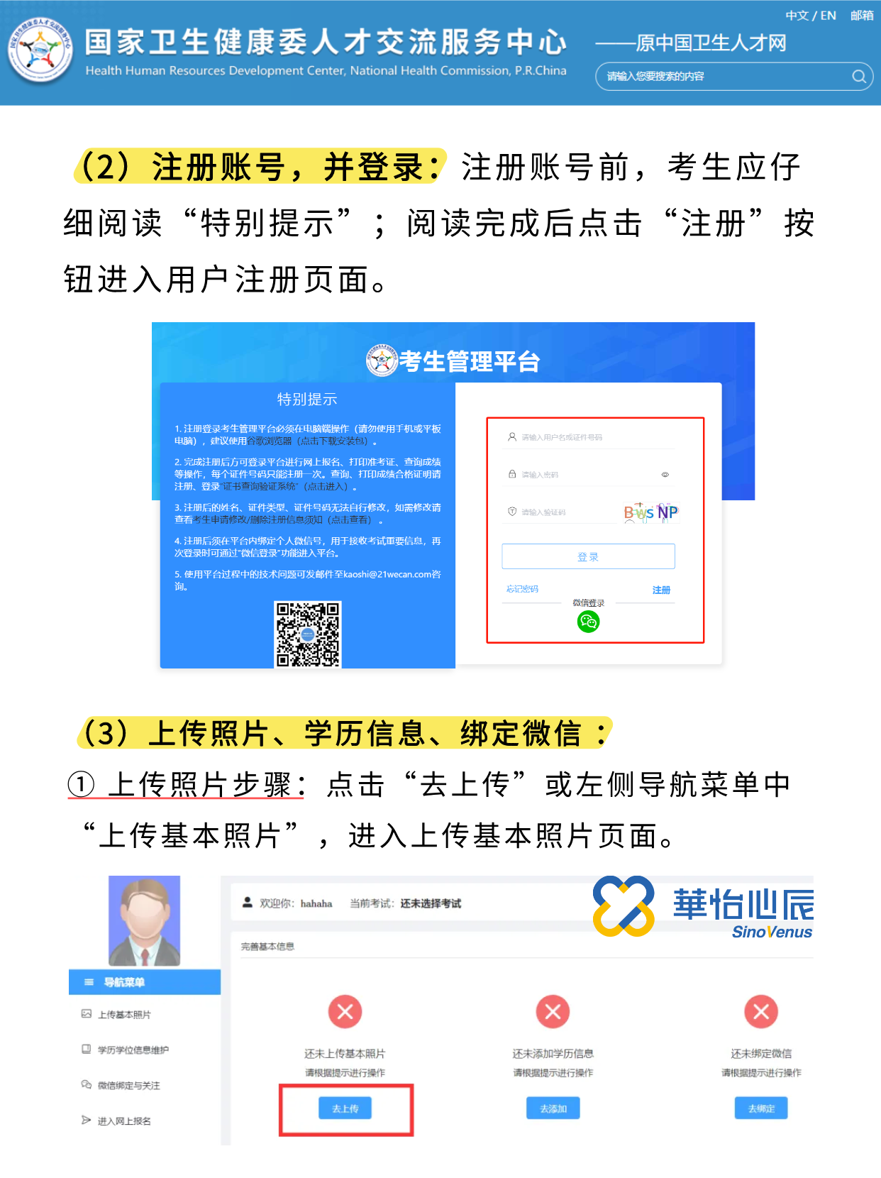新考生:注册个人账号,填写身份证号、联系方式等基础信息,绑定微信公众号(后续接收通知)