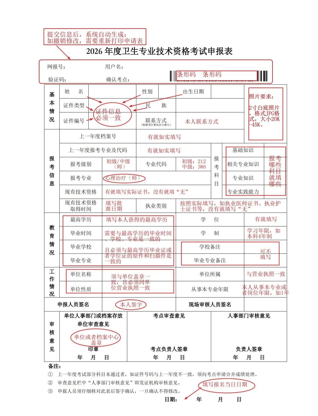 选择 “2026 年度卫生专业技术资格考试”,选定考区,如实填写工作经历(需注明医疗机构性质、心理岗位名称、工作起止时间)、学历背景等,确认无误后生成《报名申请表》,需单位加盖行政公章或人事专用章。