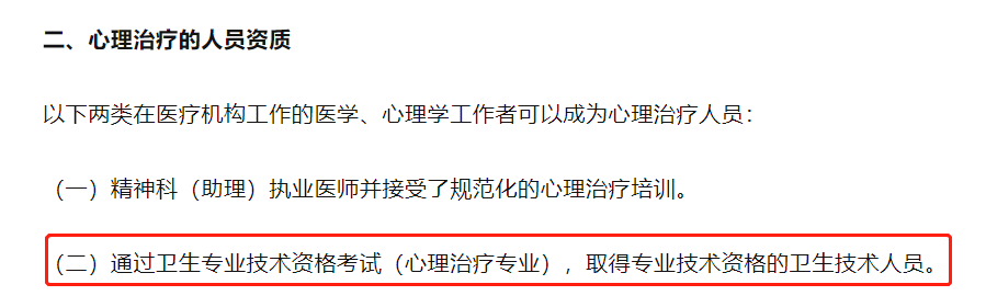 2013年12月30日发布的《心理治疗规范(2013版)》规定了心理治疗人员的资质:精神科(助理)执业医师并接受了规范化的心理治疗培训;或通过卫生专业技术资格考试(心理治疗专业),并取得专业技术资格的卫生技术人员。