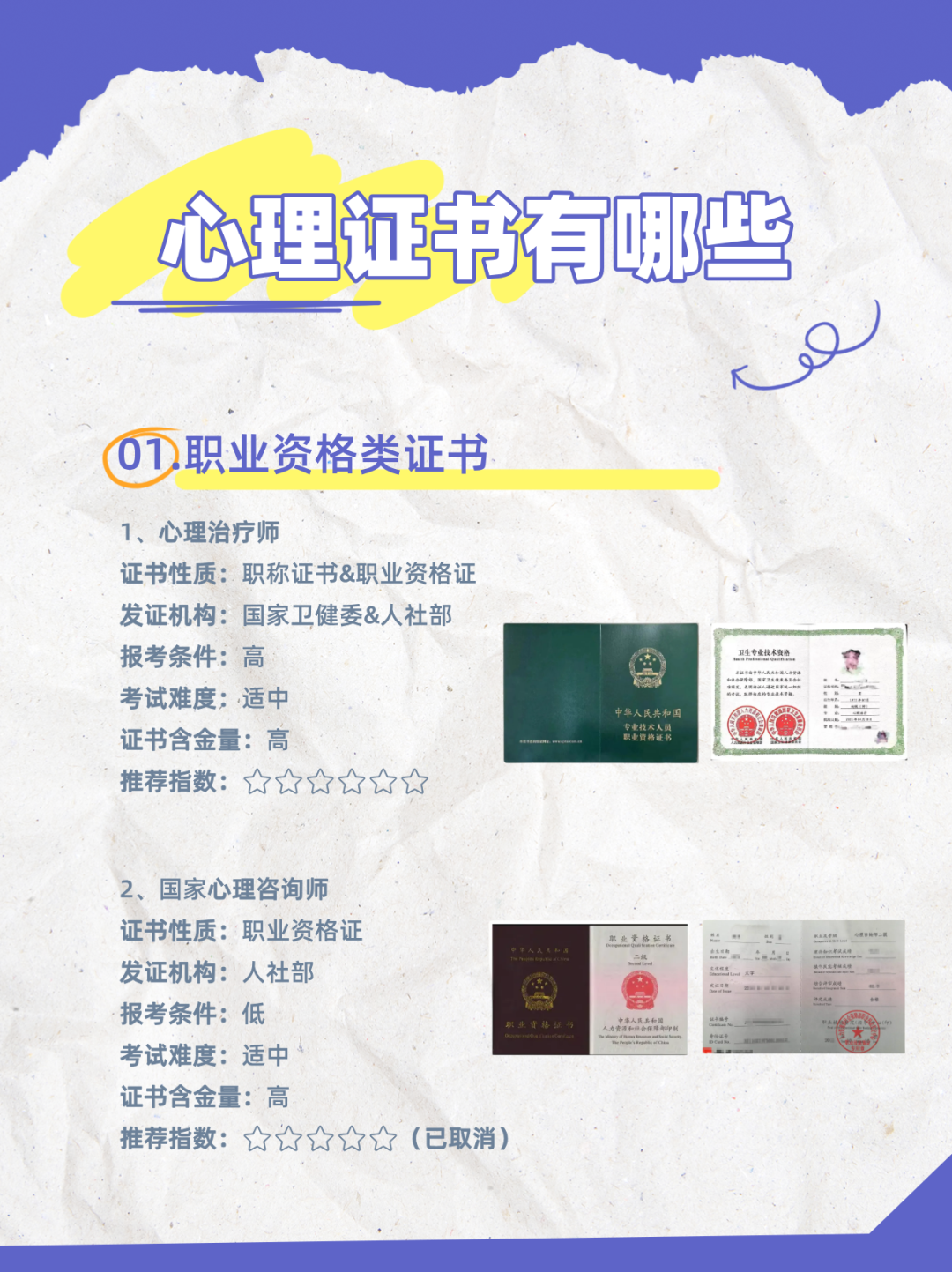 因此,目前可考的国家级心理证书只有心理治疗师一种,心理治疗师证书成为在招考的国内唯一合法执业资质,含金量远超培训类证书。