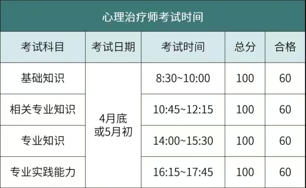 心理治疗师考试时间一般在4月-5月,每年一考。