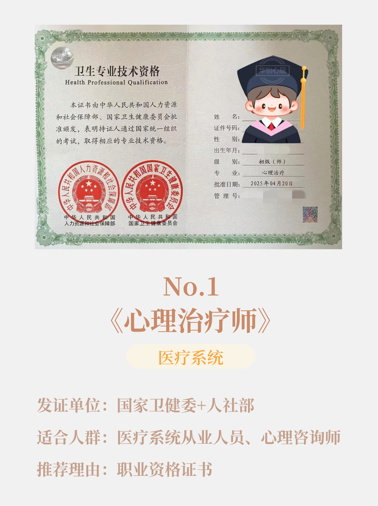 自 2017 年国家取消心理咨询师统考后,由国家卫健委统一组织、人社部与卫健委共同颁发的心理治疗师证书,已成为国内心理咨询与治疗行业唯一合法执业凭证。