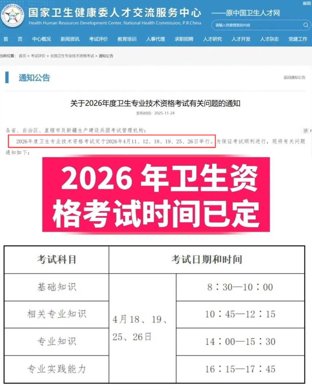 国家卫生健康委人才交流服务中心于11月24日发布了《关于2026年度卫生专业技术资格考试有关问题的通知》,明确 2026 年度卫生专业技术资格考试将于2026 年 4 月 11、12、18、19、25、26 日分批次举行。