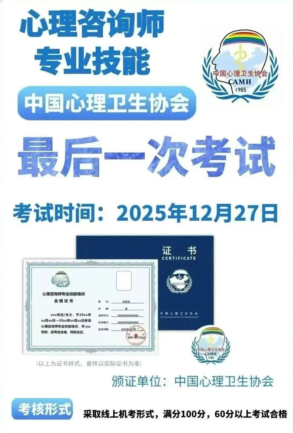 根据最新安排,2025年12月将是中国心理卫生协会心理咨询师证书考核模式的最后一次考试机会。