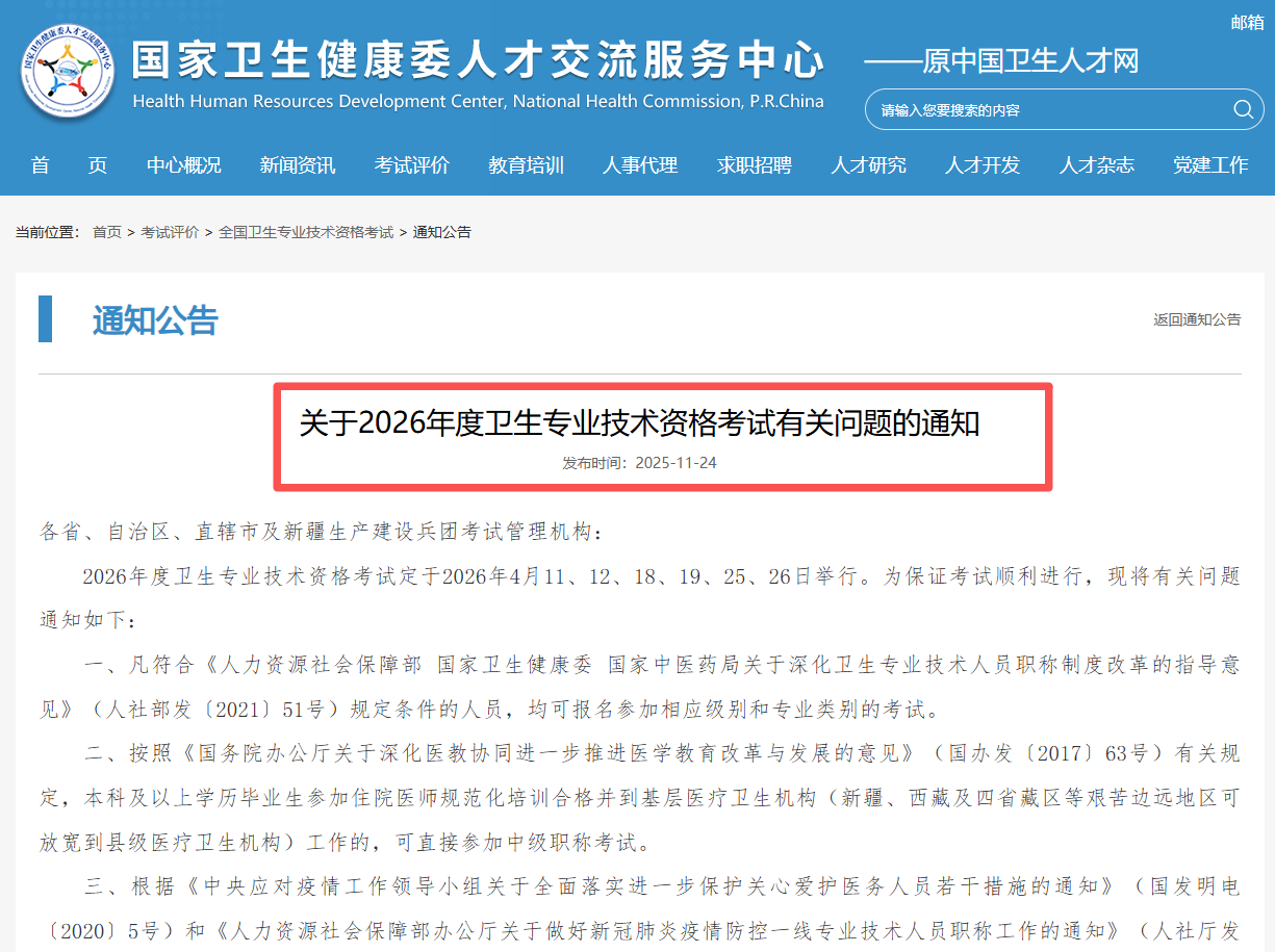 11月24日,国家卫生健康委人才交流服务中心发布了《关于2026年度卫生专业技术资格考试有关问题的通知》!