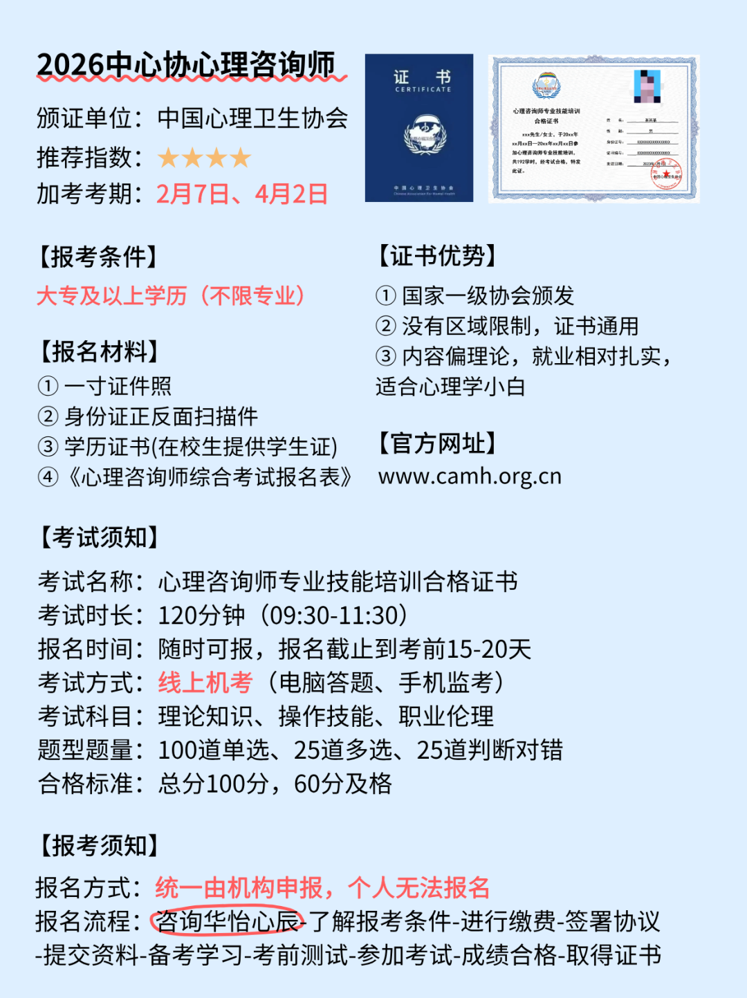 ● 学历要求:具有大专及以上学历,或具有心理学、医学、教育学等相关专业背景(政策宽松期,非专业也可以报名)。