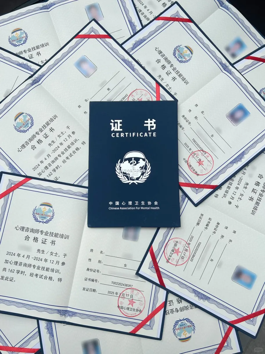 经考核合格,由中国心理卫生协会颁发《心理咨询师专业技能培训》证书。