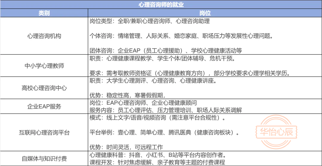 ● 职业转型:全职心理咨询师、企业EAP顾问、学校心理辅导员等。