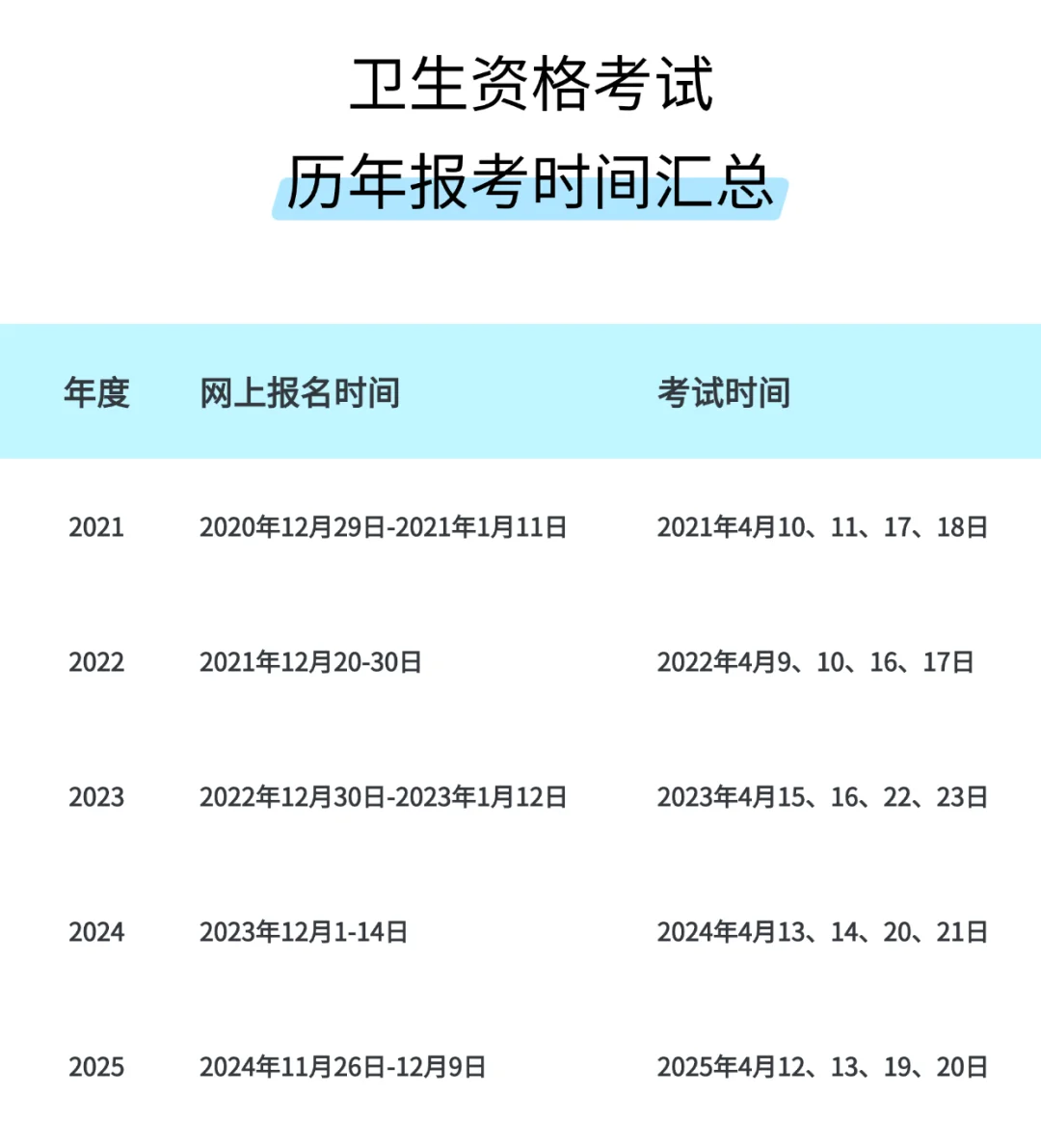 近5年,卫生专业技术资格考试官网预报名时间一般都在11月-1月,按照目前的时间进度来看,2026年报名时间可能会在11月底-12月初左右。